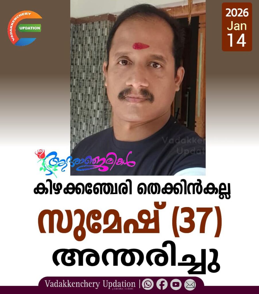 കിഴക്കഞ്ചേരി തെക്കിൻകല്ല സുമേഷ് (37) അന്തരിച്ചു. സംസ്ക്കാരംഇന്ന് (14-01-2026) രാവിലെ 10 ന് മമ്പാട് പൊതുശ്മശാനത്തിൽ. അച്ഛൻ:പരേതനായ ബാലൻ. അമ്മ: പാർവതി സഹോദരങ്ങൾ: സുരേഷ്, സുകന്യ.