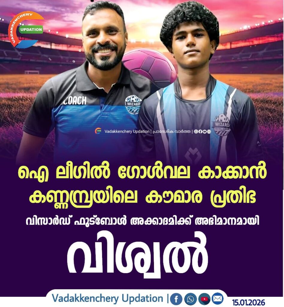 പതിനാലാം തീയതി മുതൽ ബംഗളൂരുവിൽ ആരംഭിക്കുന്ന അണ്ടർ–15 ഐ ലീഗ് ഫുട്ബോൾ ചാമ്പ്യൻഷിപ്പിൽ മുത്തൂറ്റ് ഫുട്ബോൾ അക്കാദമിയുടെ ഭാഗമായി ഗോൾവല കാക്കാൻ കണ്ണമ്പ്ര സ്വദേശി വിശ്വലിന് അവസരം ലഭിച്ചു. ഇതോടെ കണ്ണമ്പ്ര വിസാർഡ് ഫുട്ബോൾ അക്കാദമിക്ക് കൂടി അഭിമാന നിമിഷമായി.