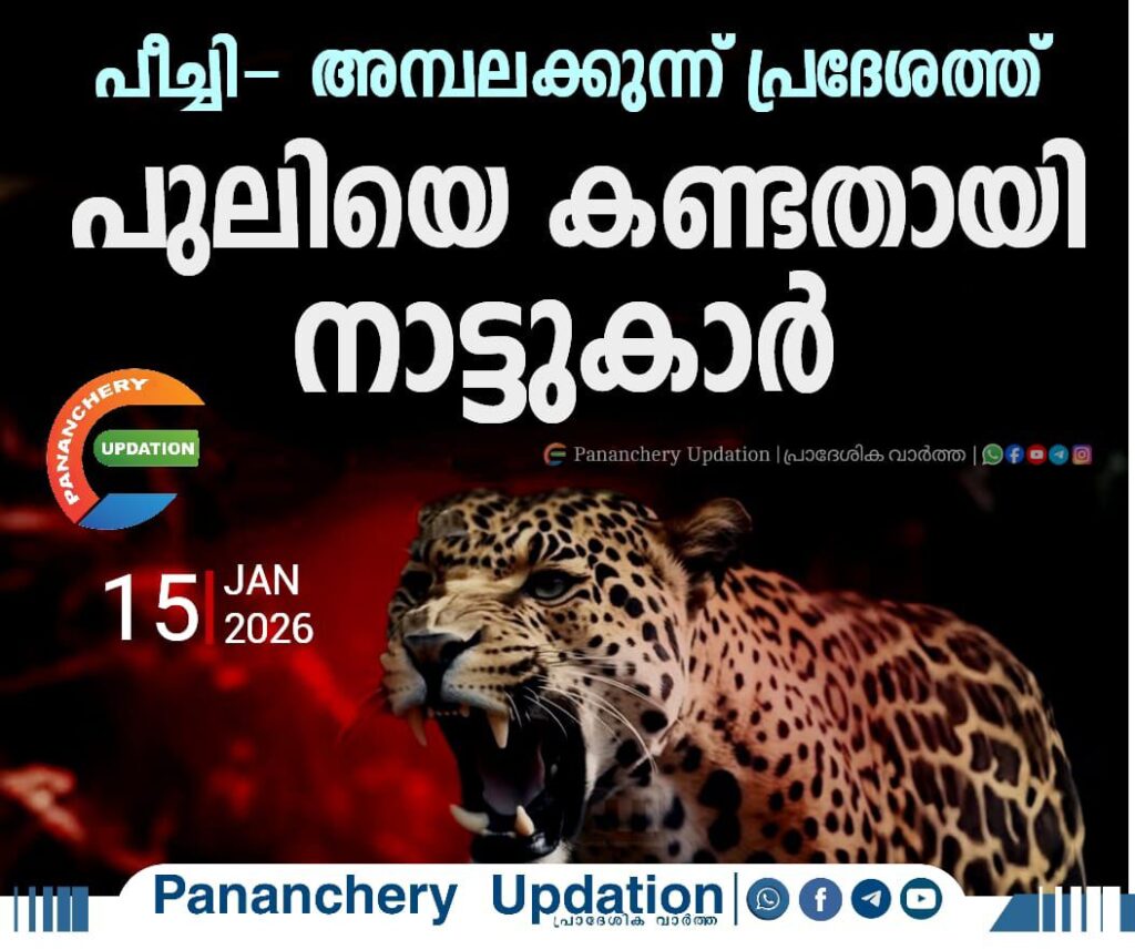 പീച്ചി–അമ്പലക്കുന്ന് ജനവാസ മേഖലയിൽ ഇന്നലെ രാത്രി ഏകദേശം 8.15ഓടെ പുലിയെ കണ്ടതായി പ്രദേശവാസികൾ. ഇതിനു മുമ്പും ഈ മേഖലയിൽ പുലിയെ കണ്ടതായി റിപ്പോർട്ടുകൾ ഉണ്ടായിട്ടുണ്ട്. പീച്ചി, തെക്കേകുളം, ജംമുക്ക്, അമ്പലക്കുന്ന് പ്രദേശങ്ങളിൽ കഴിഞ്ഞ കുറേ നാളുകളായി പുലി ഇറങ്ങുന്നതായി നാട്ടുകാർ പറയുന്നു.
