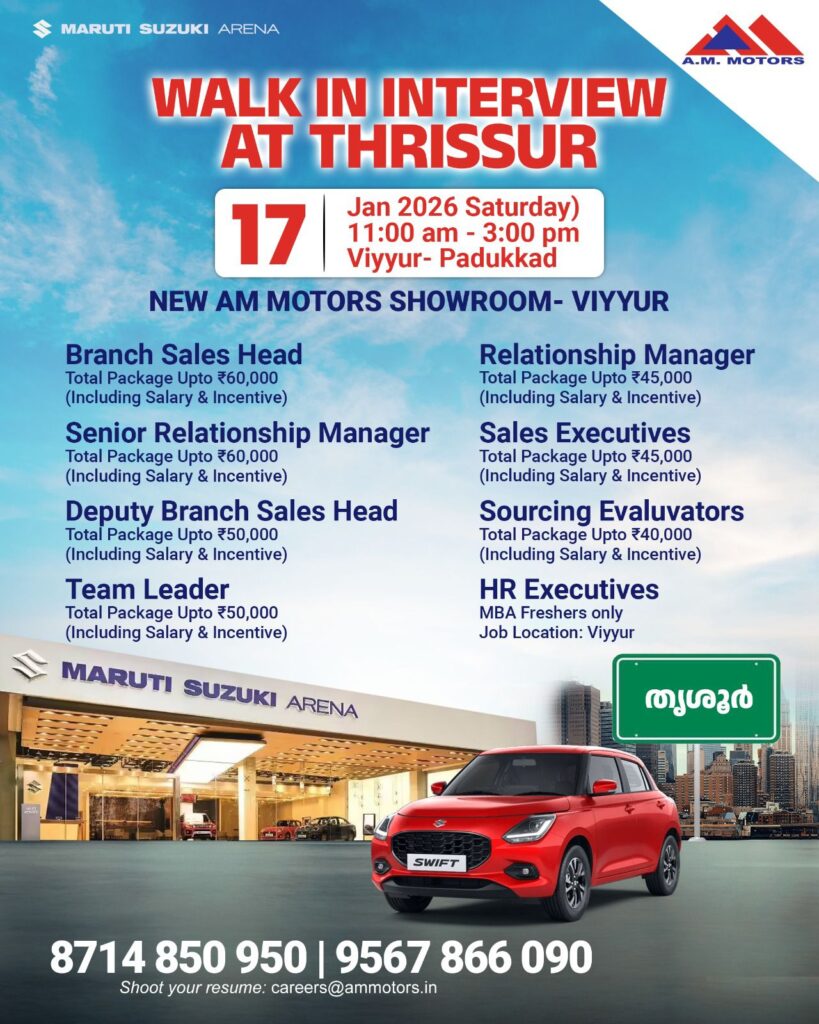 *വിയ്യൂർ* : AM MOTORS ബിസിനസ്സ് വിപുലീകരണാർത്ഥം വിവിധ (വിയ്യൂർ, മണ്ണുത്തി, കൊടകര,വടക്കാഞ്ചേരി, കുന്നംകുളം) ബ്രാഞ്ച്കളിലേക്കുള്ള ഇന്റർവ്യൂ ശനി (17-January-26) രാവിലെ 11 മണി മുതൽ 3 മണി വരെ വിയ്യൂർ AM MOTORS വെച്ച് നടക്കുന്നു. താല്പര്യമുള്ള ഉദ്യോഗാർഥികൾ ബയോഡാറ്റയുമായി ഡയറക്റ്റ് വരേണ്ടതാണ്. ഉടൻ നിയമനം ഉണ്ടായിരിക്കും.