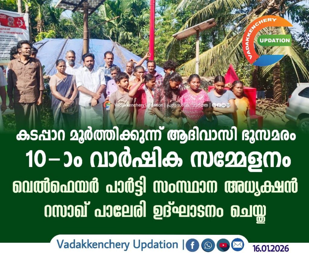 കടപ്പാറ മൂർത്തിക്കുന്ന് ആദിവാസി ഭൂസമരം 10-ാം വാർഷിക സമ്മേളനം വെൽഫെയർ പാർട്ടി സംസ്ഥാന അധ്യക്ഷൻ റസാഖ് പാലേരി ഉദ്ഘാടനം ചെയ്തു. ഊരു മൂപ്പൻ വാസുഭാസ്ക്കരൻ പതാക ഉയർത്തി. ആദിവാസി സമിതി കോർഡിനേറ്റർ സജീവൻ കള്ളിച്ചിത്ര അധ്യക്ഷനായി. എസ് സക്കീർ ഹുസൈൻ കൊല്ലങ്കോട് എസ്ഡിപിഐ, വിളയോടി ശിവൻകുട്ടി, ജില്ല പഞ്ചായത്തംഗം കെ.ജി. എൽദൊ, വണ്ടാഴി പഞ്ചായത്തംഗം അച്ചാമ്മ ജോസഫ്, ശിവരാജൻ ഗോവിന്ദാപുരം, അനൂപ് മാത്യു, ബെന്നി ജോസഫ്, ബീന ഷാജി, ടി.കെ.മുകുന്ദൻ, യമുന സുരേഷ് എന്നിവർ സംസാരിച്ചു.