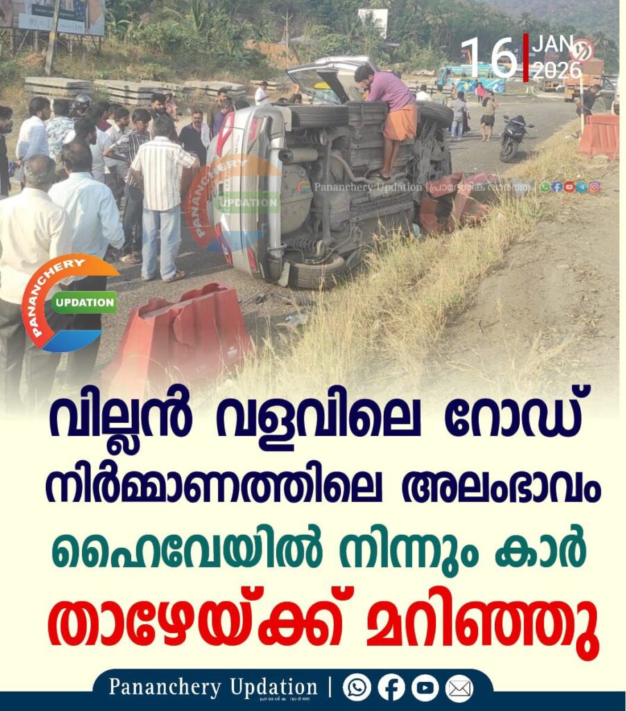 വില്ലൻ വളവിലെ റോഡ് നിർമ്മാണത്തിലെ അലംഭാവം; ഹൈവേയിൽ നിന്നും കാർ താഴേയ്ക്ക് മറിഞ്ഞു