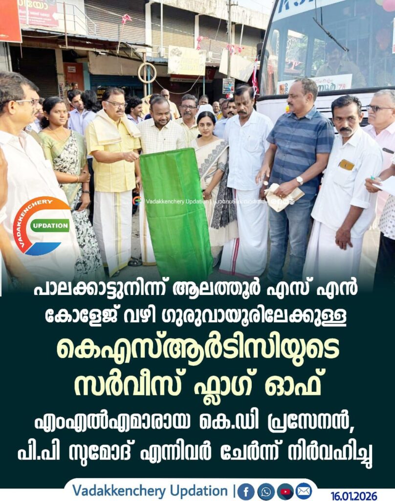 പാലക്കാട്ടുനിന്ന് ആലത്തൂർ എസ് എൻ കോളേജ് വഴി ഗുരുവായൂരിലേക്കുള്ള കെഎസ്ആർടിസി സർവീസ് ഫ്ലാഗ് ഓഫ് എംഎൽഎമാരായ കെ.ഡി പ്രസേനൻ, പി.പി സുമോദ് എന്നിവർ ചേർന്ന് നിർവഹിച്ചു