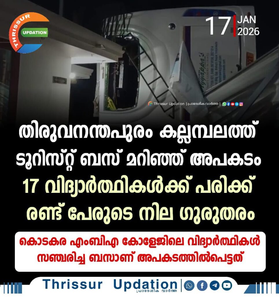 തിരുവനന്തപുരം കല്ലമ്പലത്ത് ടൂറിസ്റ്റ് ബസ് മറിഞ്ഞ് അപകടം; 17 വിദ്യാർത്ഥികൾക്ക് പരിക്ക്, രണ്ട് പേരുടെ നില ഗുരുതരo