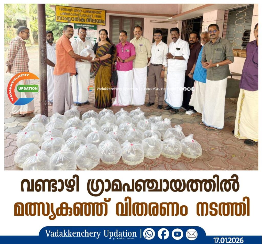 വണ്ടാഴി ഗ്രാമപഞ്ചായത്തിൽ ഫിഷറീസ് വകുപ്പും വണ്ടാഴി ഗ്രാമപഞ്ചായത്തും സംയുക്തമായി സ്വകാര്യ കുളങ്ങളിലേക്കുള്ള മത്സ്യകുഞ്ഞ് വിതരണം നടത്തി. പരിപാടിയുടെ ഉദ്ഘാടനം ഗ്രാമപഞ്ചായത്ത് പ്രസിഡന്റ് ശാരദ ഗോപിനാഥ് നിർവഹിച്ചു. വൈസ് പ്രസിഡന്റ് എസ്. സന്തോഷ് അധ്യക്ഷത വഹിച്ചു. പഞ്ചായത്ത് സെക്രട്ടറി സജീവ് കുമാർ, കെ.എൽ. രമേഷ്, മെമ്പർമാരായ ആർ. സുരേഷ്, ഡിനോയ് കോമ്പാറ, പ്രമോദ് തണ്ടലോട്, കലാധരൻ എന്നിവർ പരിപാടിയിൽ പങ്കെടുത്തു