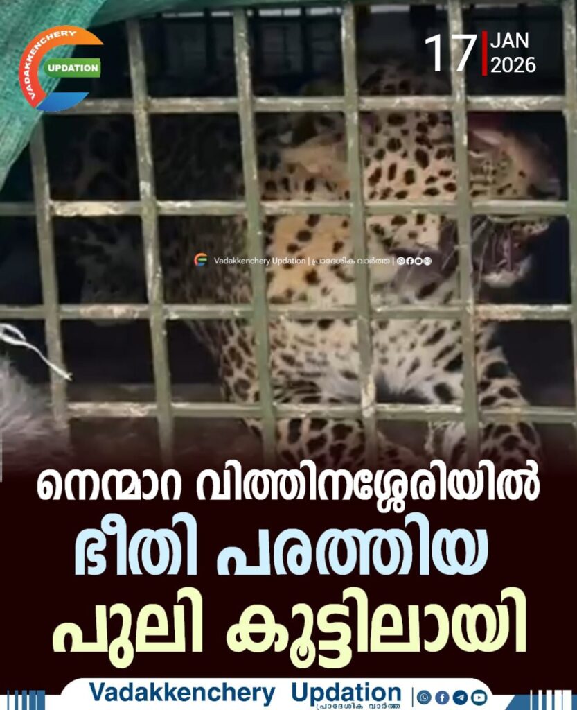 നെന്മാറ വിത്തിനശ്ശേരിയിൽ ജനങ്ങളെ ഭീതിയിലാഴ്ത്തിയ പുലി വനംവകുപ്പ് സ്ഥാപിച്ച കൂട്ടിൽ കുടുങ്ങി. കഴിഞ്ഞ കുറച്ചു നാളുകളായി പാലക്കാടിന്റെ വിവിധ മേഖലകളിൽ, പ്രത്യേകിച്ച് നെന്മാറ, മണ്ണാർക്കാട് ഭാഗങ്ങളിൽ പുലിശല്യം രൂക്ഷമായിരുന്നു.