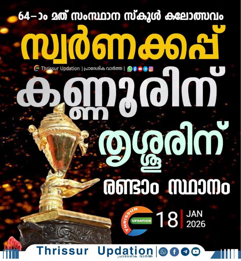64-ാമത് സംസ്ഥാന സ്കൂൾ കലോത്സവത്തിൽ കിരീടം ഉറപ്പിച്ച് കണ്ണൂർ. മുൻ ചാമ്പ്യൻമാരായ തൃശൂരിനാണ് രണ്ടാം സ്ഥാനം. 1028 പോയിൻ്റോടെയാണ് കണ്ണൂർ കിരീടമുറപ്പിച്ചിരിക്കുന്നത്. ഏറ്റവും അവസാനമായി പുറത്തുവന്ന വഞ്ചിപ്പാട്ടിന്റെ ഫലവും അപ്പീലുകളുടെ ഫലവും പുറത്തുവന്നതോടെയാണ് കണ്ണൂർ ജേതാക്കളായിരിക്കുന്നത്.1023 പോയിന്റോടെയാണ് തൃശൂർ രണ്ടാം സ്ഥാനം കരസ്ഥമാക്കിയിരിക്കുന്നത്. കോഴിക്കോടുമായി ഒപ്പത്തിനൊപ്പം അവസാനദിവസം വരെ പോരാടിയെങ്കിലും അവസാനലാപ്പിൽ തൃശൂർ രണ്ടാം സ്ഥാനം അരക്കെട്ടുറപ്പിക്കുകയായിരുന്നു. 1017 പോയിന്റുകളാണ് കോഴിക്കോടിന് ലഭിച്ചത്.