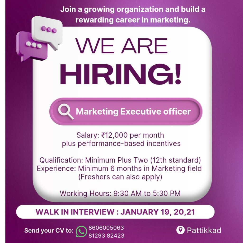 കേന്ദ്ര ഗവണ്മെന്റിന്റെ കീഴിൽ പ്രവർത്തിക്കുന്ന മൾട്ടി സ്റ്റേറ്റ് സൊസൈറ്റി ഓഫീസിൽ Marketing Executive officer ഒഴിവുകൾ