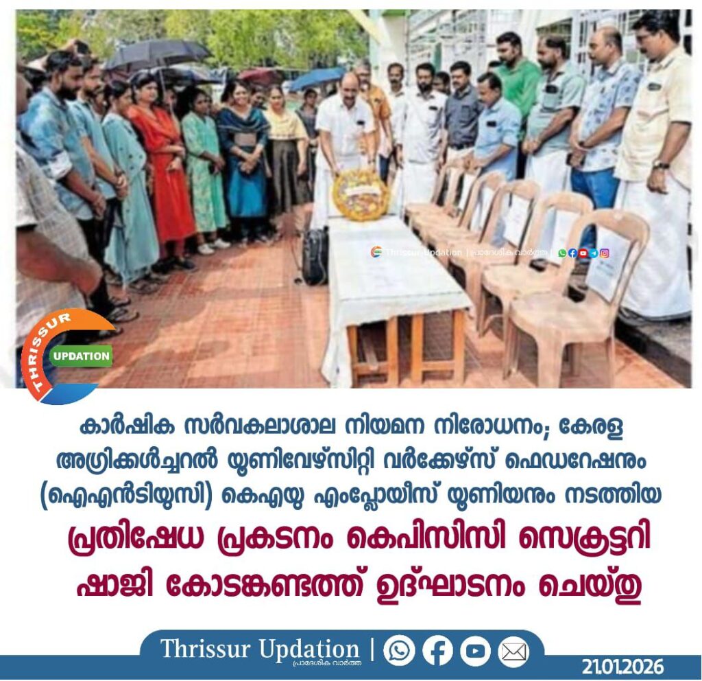 കാർഷിക സർവകലാശാല നിയമന നിരോധനം; കേരള അഗ്രിക്കൾച്ചറൽ യൂണിവേഴ്സിറ്റി വർക്കേഴ്സ് ഫെഡറേഷനും (ഐഎൻടിയുസി) കെഎയു എംപ്ലോയീസ് യൂണിയനും നടത്തിയ പ്രതിഷേധ പ്രകടനം കെപിസിസി സെക്രട്ടറി ഷാജി കോടങ്കണ്ടത്ത് ഉദ്ഘാടനം ചെയ്തു