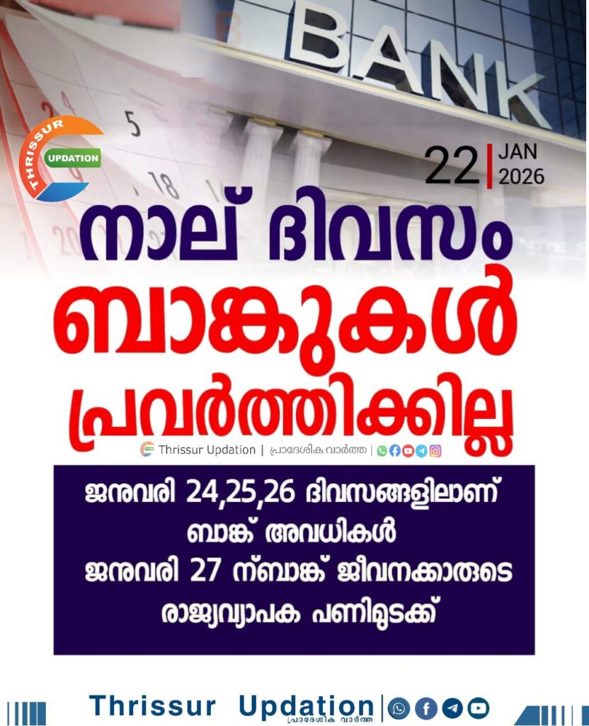 ജനുവരി 24,25,26 ദിവസങ്ങളിലാണ് ബാങ്ക് അവധികള്.