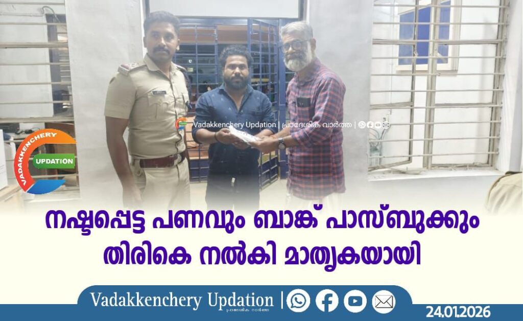 വടക്കഞ്ചേരി എസ്.ഐയുടെ നേതൃത്വത്തിൽ നടന്ന നടപടികളിലൂടെയാണ് പണവും ബാങ്ക് പാസ്ബുക്കും സജി കൃഷ്ണന് കൈമാറിയത്. നഷ്ടപ്പെട്ട വസ്തുക്കൾ ഉടമയ്ക്ക് തിരികെ നൽകി മാതൃകയായ പ്രവർത്തനമാണ് പ്രകാശ് നടത്തിയതെന്ന് പൊലീസ് അറിയിച്ചു.