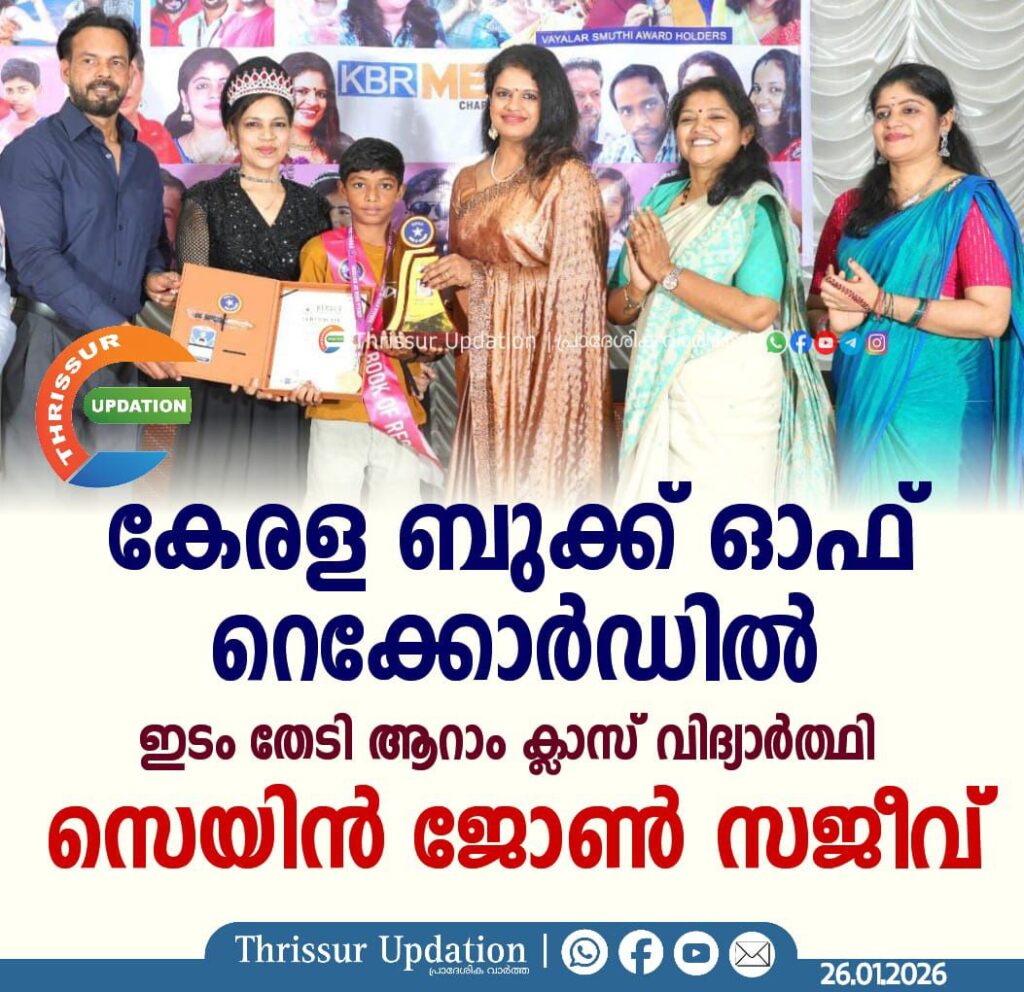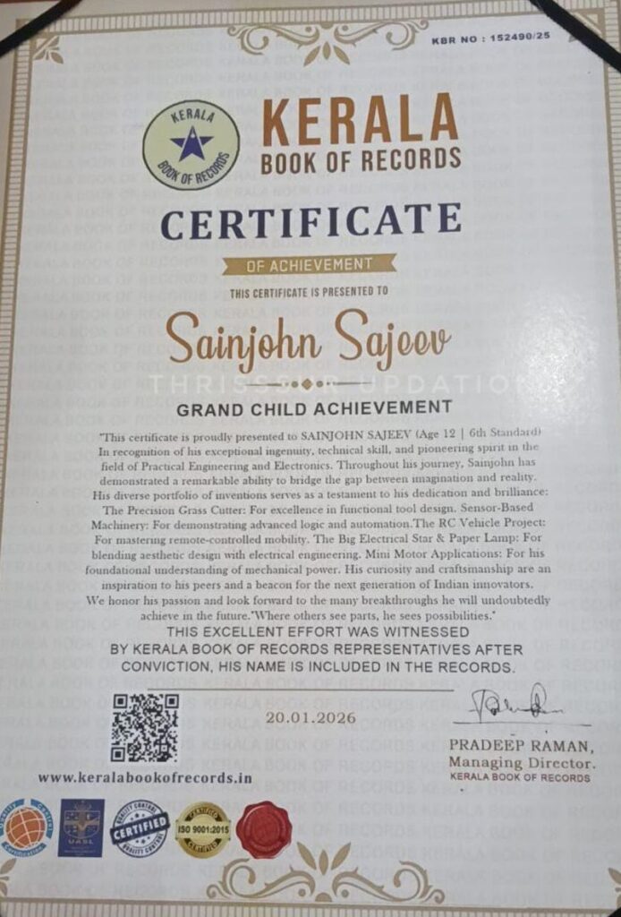 കേരള ബുക്ക് ഓഫ് റെക്കോർഡിൽ ഇടം തേടി ആറാം ക്ലാസ് വിദ്യാർത്ഥി സെയിൻ ജോൺ സജീവ്