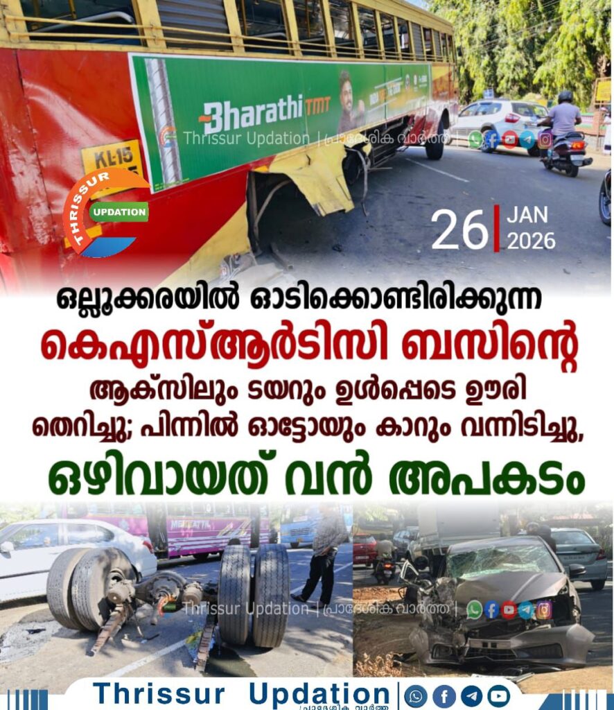 തൃശ്ശൂർ- മണ്ണുത്തി റോഡിൽ ഒല്ലൂക്കര സെന്റി റിൽ കോർപ്പറേഷൻ സോണൽ ഓഫീസിന് മുമ്പിൽ ഓടിക്കൊണ്ടിരിക്കെ കെഎസ്ആർടിസി ബസിൻ്റെ ആക്സിലും ടയറും ഉൾപ്പെടെ ഊരിത്തെറിച്ചു. പിറകിൽ വന്നിരുന്ന കാറും ഗുഡ്സ് ഓട്ടോറിക്ഷയും ബസ്സിന് പുറകിൽ വന്നിടിച്ചു. തലനാരിഴയ്ക്ക് വൻദുരന്തം ഒഴിവായി.തിങ്കളാഴ്ച്ച രാവിലെ ഒമ്പത് മണിക്കായിരുന്നു സംഭവം. അപകടത്തിൽ കാറും ഗുഡ്സ് ഓട്ടോറിക്ഷയും ബസ്സിൻ്റെ പിൻഭാഗവും ഭാഗികമായി തകർന്നു. ആർക്കും പരിക്കില്ല. അപകടത്തെത്തുടർന്ന് അരമണിക്കൂറോളം മേഖലയിൽ ഗതാഗതം തടസ്സപ്പെട്ടു.