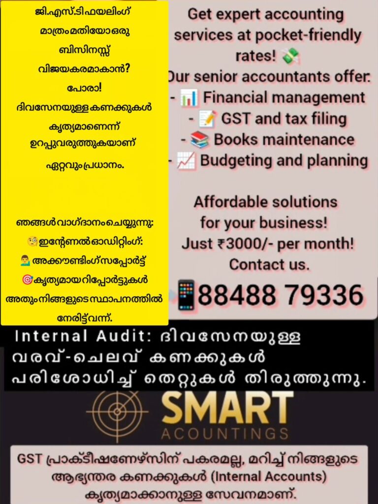 *ശ്രദ്ധിക്കുക:* ഞങ്ങൾ GST പ്രാക്ടീഷണേഴ്സിന് പകരമല്ല. നിങ്ങളുടെ സ്ഥാപനത്തിൻ്റെ ആഭ്യന്തര കണക്കുകൾ കൃത്യമാക്കാൻ സഹായിക്കുന്ന വിശ്വസ്ത പങ്കാളിയാണ്.