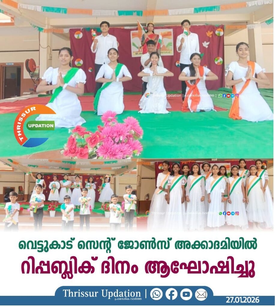 വെട്ടുകാടുള്ള സെന്റ് ജോൺസ് അക്കാദമിയിൽ ജനുവരി 26-ാം തീയതി റിപ്പബ്ലിക് ദിനം ആഘോഷിച്ചു. റവ. സിസ്റ്റർ ഉദയ എസ്.ജെ.ബി ദേശീയ പതാക ഉയർത്തി ആഘോഷങ്ങൾക്ക് തുടക്കം കുറിച്ചു. തുടർന്ന് സ്കൂളിന്റെ പ്രിൻസിപ്പൽ സിസ്റ്റർ റോഷ്നി റിപ്പബ്ലിക് ദിനത്തിന്റെ പ്രാധാന്യം വിശദീകരിച്ചുകൊണ്ട് സന്ദേശം നൽകി.