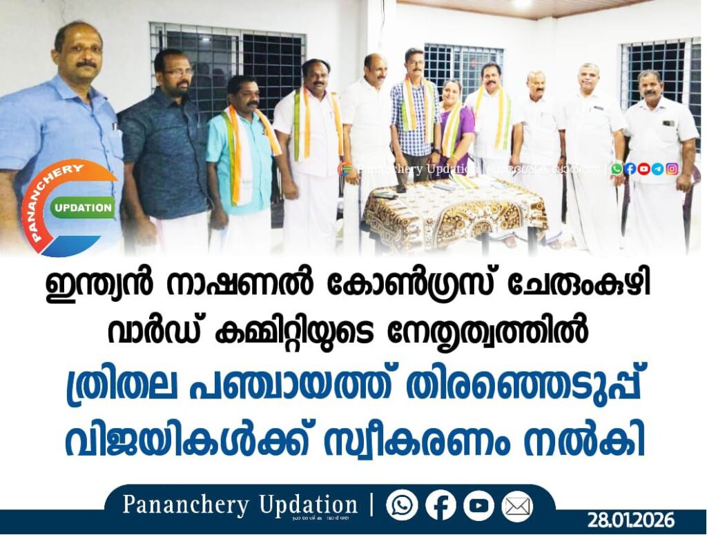 ഇന്ത്യൻ നാഷണൽ കോൺഗ്രസ് ചേരുംകുഴി വാർഡ് കമ്മിറ്റിയുടെ നേതൃത്വത്തിൽ ത്രിതല പഞ്ചായത്ത് തിരഞ്ഞെടുപ്പ് വിജയികൾക്ക് സ്വീകരണം നൽകി