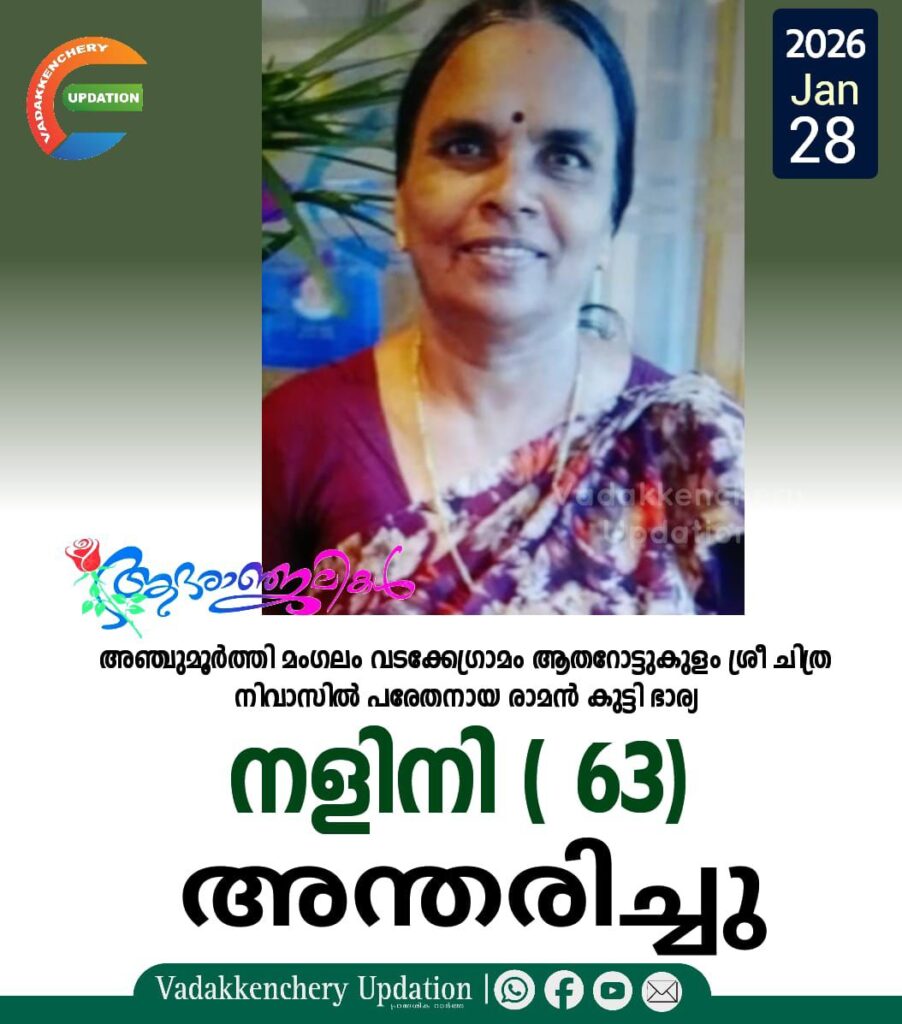 അഞ്ചുമൂർത്തി മംഗലം വടക്കേഗ്രാമം ആതറോട്ടുകുളം ശ്രീ ചിത്ര നിവാസിൽ പരേതനായ രാമൻ കുട്ടി (Retd കോ ഓപ്പറേറ്റീവ് ബാങ്ക് വടക്കഞ്ചേരി ) ഭാര്യ നളിനി ( 63) അന്തരിച്ചു. സംസ്ക്കാരം ഇന്ന് (28/1/2026- ബുധൻ) പാമ്പാടി ഐവർ മഠം ശ്മശാനത്തിൽ.മക്കൾ :- രമ്യ, ചിത്ര.. മരുമക്കൾ :-ശിവകുമാർ
