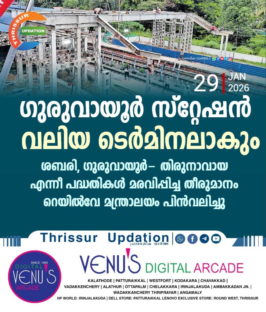 ഗുരുവായൂർ സ്റ്റേഷൻ വലിയ ടെർമിനലാകും; ശബരി, ഗുരുവായൂർ- തിരുനാവായ എന്നീ പദ്ധതികൾ മരവിപ്പിച്ച തീരുമാനം റെയിൽവേ മന്ത്രാലയം പിൻവലിച്ചു