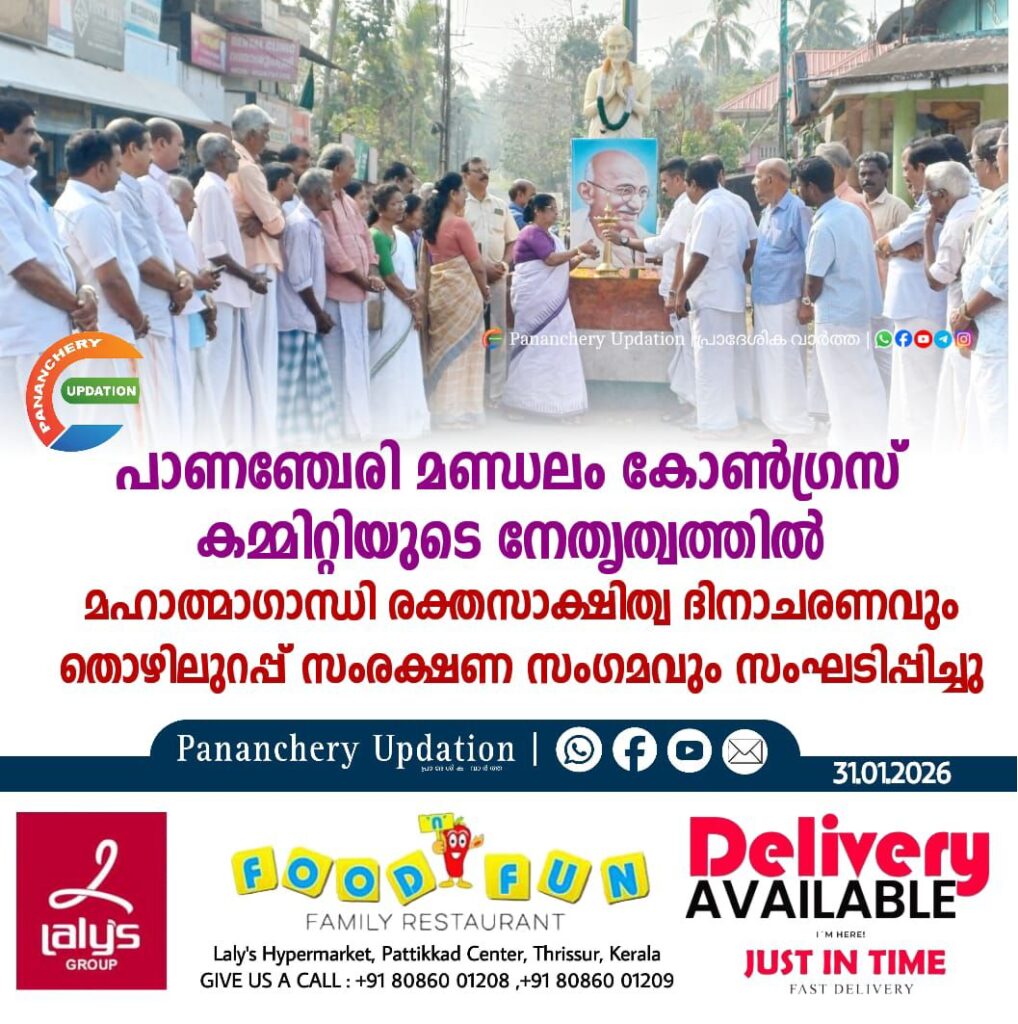 പാണഞ്ചേരി മണ്ഡലം കോൺഗ്രസ് കമ്മിറ്റിയുടെ നേതൃത്വത്തിൽ മഹാത്മാഗാന്ധി രക്തസാക്ഷിത്വ ദിനാചരണവും തൊഴിലുറപ്പ് സംരക്ഷണ സംഗമവും സംഘടിപ്പിച്ചു