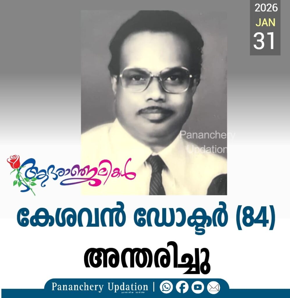 പാണഞ്ചേരി ഗ്രാമപഞ്ചായത്തിൽ ആതുര സേവനരംഗത്ത് ദീർഘവർഷം പ്രവർത്തിച്ചിരുന്ന നടത്തറ ചേനങ്ങകത്ത് വീട്ടിൽ ഡോ. സി.എസ് കേശവൻ (84) അന്തരിച്ചു. സംസ്കാരം നാളെ (01.02.2026 ഞായറാഴ്ച) വൈകിട്ട് നാലുമണിക്ക് വടൂക്കര ശ്മശാനത്തിൽ. ഭാര്യ പരേതയായ സുമിത്ര. മക്കൾ: ബിജു, പരേതനായ ബിനു, മിനു.