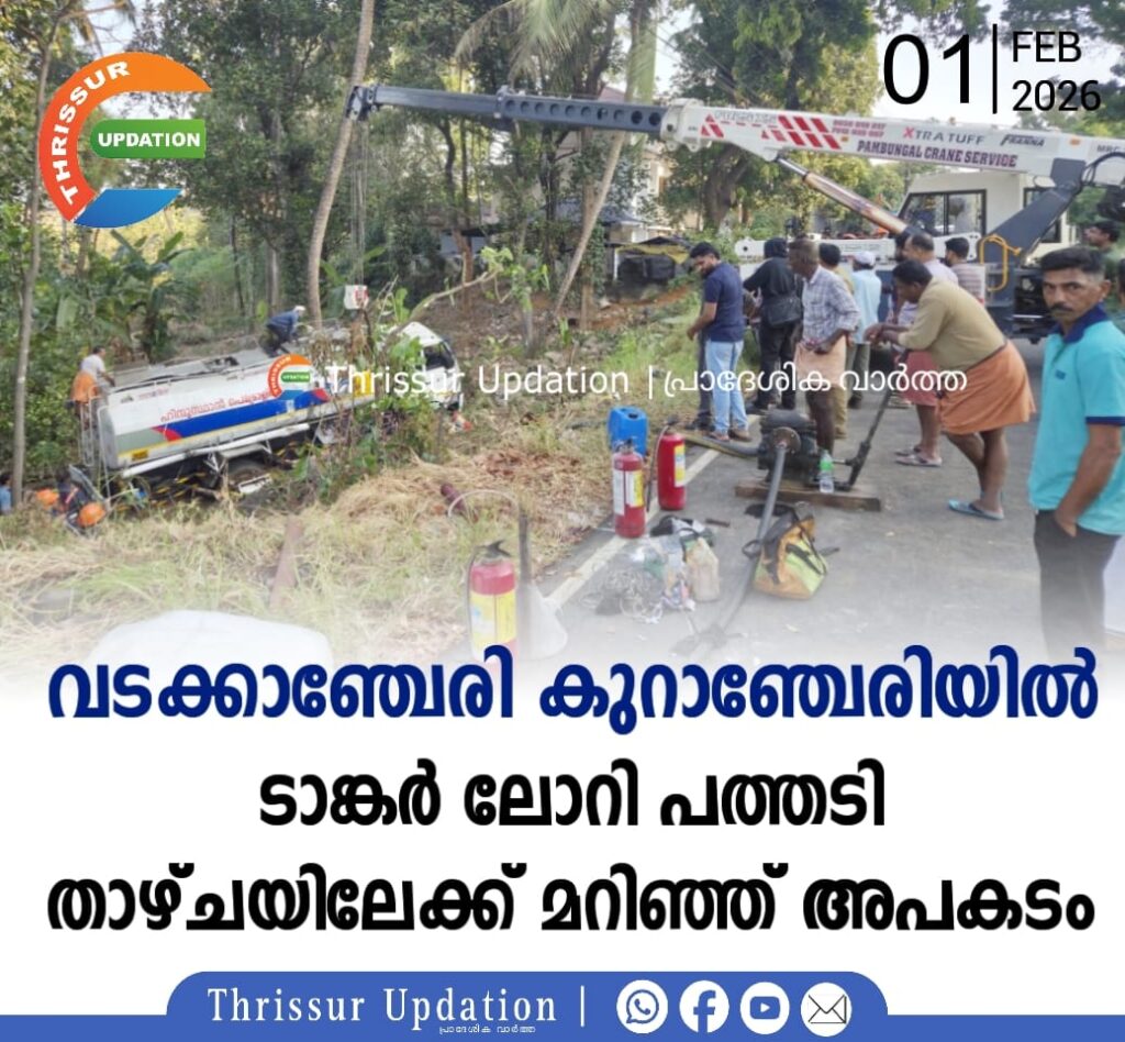ഇരുമ്പനം HPCL ഡിപ്പോയിൽ നിന്നും ചെർപ്പുളശ്ശേരി പമ്പിലേക്ക് 9,000 ലിറ്റർ പെട്രോളും 5,000 ലിറ്റർ ഡീസലുമായി (ആകെ 14,000 ലിറ്റർ) പോയികൊണ്ടിരുന്ന പെട്രോൾ ടാങ്കർ ലോറി വടക്കാഞ്ചേരി മുനിസിപ്പാലിറ്റി ഡിവിഷൻ 27 കുറാഞ്ചേരിയിൽ നിയന്ത്രണം വിട്ട് ഏകദേശം 10 അടി താഴ്ചയിലേക്ക് മറിഞ്ഞു. അപകടത്തെ തുടർന്ന് ടാങ്കർ ലോറിയുടെ വിവിധ ഭാഗങ്ങൾ തകർന്നതോടെ ഇന്ധനം ചോർന്നതായി റിപ്പോർട്ട് ചെയ്തു.