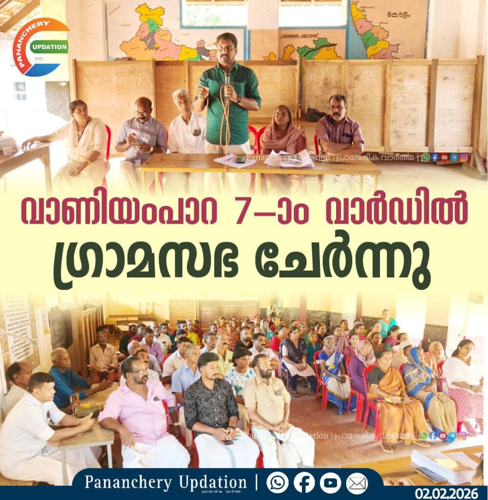 വാണിയംപാറ ഗ്രാമസഭ ഇ.കെ.എം.യു.പി സ്കൂളിൽ വച്ച് ചേർന്നു. വാർഡ് മെമ്പർ സനിൽ വാണിയംപാറ അധ്യക്ഷത വഹിച്ചു. 2026-2027 സാമ്പത്തിക വർഷത്തിലെ പദ്ധതി രൂപീകരണവും, വികസനപ്രവർത്തനങ്ങളും മുൻനിർത്തി ചർച്ചകൾ നടന്നു. ബ്ലോക്ക് പഞ്ചായത്ത് വൈസ് പ്രസിഡന്റ് മാത്യു നൈനാൻ, വിവിധ രാഷ്ട്രീയ പാർട്ടി നേതാക്കളായിട്ടുള്ള ഷാബു നീലിപാറ, സെബാസ്റ്റ്യൻ, മൊയ്ദീൻകുട്ടി, ശിവകുമാർ എന്നിവർ സംസാരിച്ചു. പഞ്ചായത്ത് കോ-ഓർഡിനേറ്റർ, അങ്കണവാടി ടീച്ചർമാർ, ആശ വർക്കർ, എന്നിവർ നേതൃതം നൽകി.