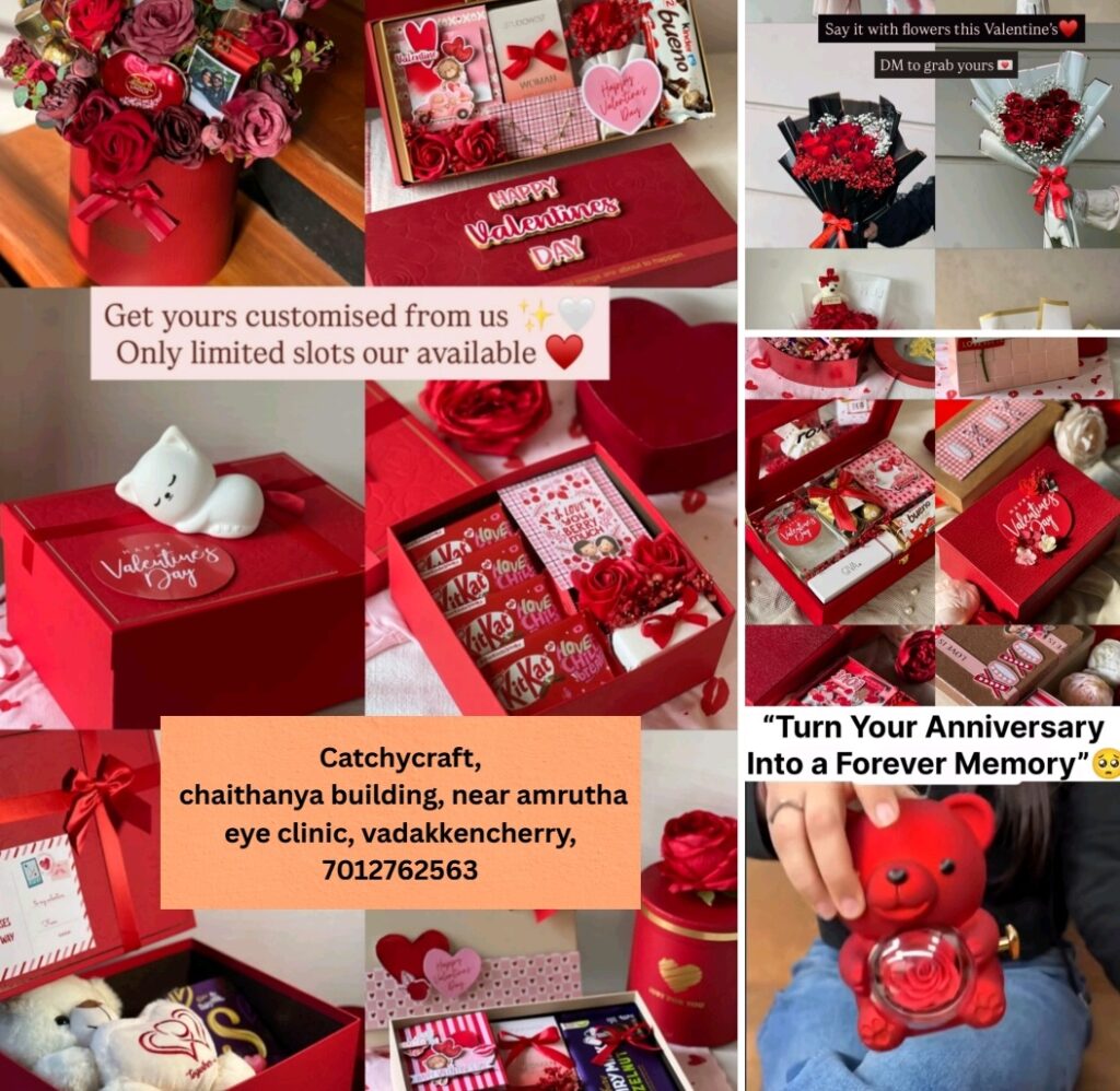 ഇനി എന്തിന് കാത്തിരിക്കണം വിളിച്ച് നിങ്ങൾ സ്നേഹിക്കുന്നവർക്ക് ഗിഫ്റ്റ് ഹാമ്പരുകൾ ബുക്ക് ചെയ്യൂ. നിങ്ങളുടെ പ്രിയപ്പെട്ട എല്ലാ നിമിഷങ്ങളും മനോഹരംമാകാം catchycraft ഇണ്ട് കൂടെ, birthday, anniversary,flower bouquet,സർപ്രൈസ് ഗിഫ്റ്റുകൾ എല്ലാം customize ചെയ്ത് കൊടുക്കുന്നതാണ്