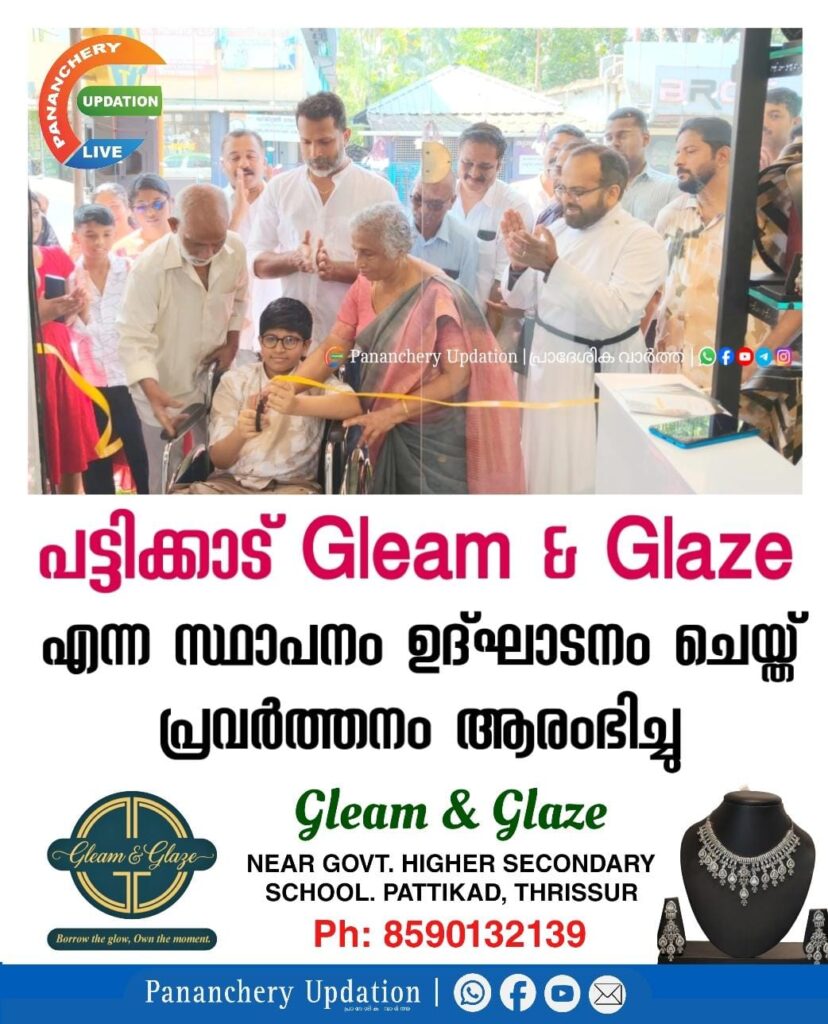 പട്ടിക്കാട് ഗവ. ഹയർ സെക്കൻഡറി സ്കൂളിന് സമീപം വാടകയ്ക്കും വിൽപ്പനക്കും പ്രീമിയം ആഭരണങ്ങൾ ലഭ്യമാക്കുന്ന Gleam & Glaze എന്ന സ്ഥാപനം ഉദ്ഘാടനം ചെയ്തത് പ്രവർത്തനം ആരംഭിച്ചു. ഫാദർ അഭിൻ ഡാനിയർ , വ്യാപാരി വ്യവസായി ഏകോപന പ്രസിഡൻ്റ് ജോബി പറപ്പുള്ളി മുഖ്യ അതിഥിയായി. വിവാഹവും പ്രത്യേക അവസരങ്ങളും ലക്ഷ്യമാക്കി ഡിസൈനർ ആഭരണങ്ങളുടെ വിപുലമായ ശേഖരം ഒരുക്കിയിട്ടുണ്ട്. ട്രഡീഷണൽ ജ്വല്ലറി, ടെമ്പിൾ ജ്വല്ലറി കളക്ഷൻ, വെസ്റ്റേൺ ജ്വല്ലറി കളക്ഷൻ, ഇയർ റിംഗ്സ്, റിങ്ങ്സ്…….. തുടങ്ങി ആഭണങ്ങളുടെ വിപുലമായ കളക്ഷൻസ് ഒരുക്കിയിട്ടുണ്ട്.
