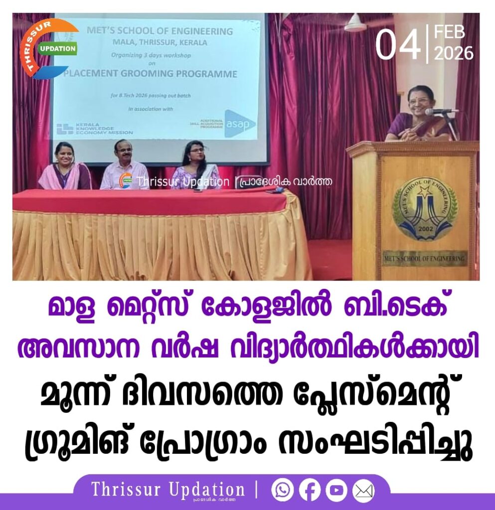 തൃശ്ശൂർ, മാള മെറ്റ്സ് സ്കൂൾ ഓഫ് എഞ്ചിനീയറിങിൽ 2022-2026 ബാച്ച് ബി.ടെക് അവസാന വർഷ വിദ്യാർത്ഥികൾക്കായി സംഘടിപ്പിച്ച 3 ദിവസത്തെ പ്ലേസ്മെന്റ് ഗ്രൂമിങ് പ്രോഗ്രാം നല്ല രീതിയിൽ ഇന്ന് സമാപിച്ചു. കേരള നോളജ് ഇക്കണോമി മിഷന്റെ യും അഡീഷണൽ സ്കിൽ അക്വേഷൻ പ്രോഗ്രാമിൻ്റേയും (അസാപ്) സഹായത്തോടെ നടന്ന ഈ പരിശീലന പരിപാടി വിദ്യാർത്ഥികളുടെ തൊഴിൽ സാധ്യതകൾ വർദ്ധിപ്പിക്കുന്നതിനുള്ള പ്രത്യേക പരിശീലനമായിരുന്നു. പരിശീലന പരിപാടി മെറ്റ്സ് ഗ്രൂപ്പ് ഓഫ് ഇൻസ്റ്റിറ്റ്യൂഷൻസ് സിഇഒ അഡ്വ. (ഡോ.) ജോർജ് കോലഞ്ചേരി ഉദ്ഘാടനം ചെയ്തു. കഴിഞ്ഞവർഷം ഈ കോളേജിൽ നിന്നും എൻജിനീയറിങ് ബിരുദമെടുത്ത എല്ലാവർക്കും തന്നെ പ്ലേസ്മെന്റ് ആയ കാര്യം അദ്ദേഹം എടുത്ത് പറഞ്ഞു. ചടങ്ങിൽ അക്കാദമിക് ഡയറക്ടർ ഡോ. ആറ്റൂർ സുരേന്ദ്രൻ, പ്ലേസ്മെന്റ് ഓഫീസർ ഡോ. സുമി മാരിയ ബാബു എന്നിവർ സംസാരിച്ചു. കേരള സർക്കാർ, അസാപ്, സ്കിൽ ഡെവലപ്മെൻറ് എക്സിക്യൂട്ടീവ് സ്മിത കെ.എസ്. ൻ്റെ നേതൃത്വത്തിൽ ആയിരുന്നു പരിശീലന പരിപാടി. ഫെബ്രുവരി 2 മുതൽ 4 വരെ രാവിലെ 9:30 മുതൽ ഉച്ചകഴിഞ്ഞ് 3:30 വരെ സെമിനാർ ഹാളിൽ നടന്ന വർക്ക്ഷോപ്പിൽ പേഴ്സണാലിറ്റി ഗ്രൂമിങ്, ഇന്റർവ്യൂ തയ്യാറെടുപ്പ്, സോഫ്റ്റ് സ്കിൽസ് തുടങ്ങിയവയിൽ പരിശീലനം നൽകി. പരിശീലന പരിപാടിയുടെ സമാപന ചടങ്ങിൽ മെറ്റ്സ് സ്കൂൾ ഓഫ് എൻജിനീയറിങ് പ്രിൻസിപ്പാൾ പ്രൊഫ. (ഡോ.) അംബികാ ദേവി അമ്മ ടി. മുഖ്യപ്രഭാഷണം നടത്തി.