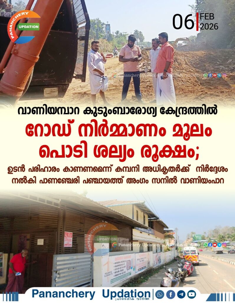 വാണിയമ്പാറ കുടുംബാരോഗ്യ കേന്ദ്രത്തിൽ റോഡ് നിർമ്മാണം മൂലം പൊടി ശല്യം രൂക്ഷം; ഉടൻ പരിഹാരം കാണണമെന്ന് കമ്പനി അധികൃതർക്ക് നിർദ്ദേശം നൽകി പാണഞ്ചേരി പഞ്ചായത്ത് അംഗം സനിൽ വാണിയംപാറ