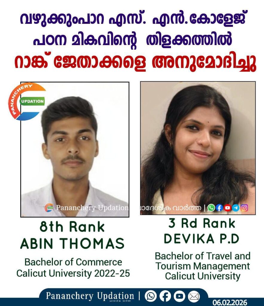 കാലിക്കറ്റ് യൂണിവേഴ്സിറ്റി FYUGP 2022-2025 ലെ എട്ടാം റാങ്ക് നേടിക്കൊണ്ട് ബാച്ച്ലർ ഓഫ് കോമേഴ്സ് വിദ്യാർഥി അബിൻ തോമസ് കോളേജിൻ്റെ അഭിമാനമായി.ബാച്ച്ലർ ഓഫ് ട്രാവൽ ആൻഡ് ടൂറിസം മാനേജ്മെൻ്റ് വിദ്യാർത്ഥി ദേവിക പി.ഡി മൂന്നാം റാങ്കോടെ മികച്ച വിജയം കരസ്ഥമാക്കി ജൂനിയർ വിദ്യാർഥികൾക്ക് മാതൃകയായ ഈ വിദ്യാർത്ഥികൾ കോളേജിൻ്റെ മികവിൻ്റെ അടയാളങ്ങളായിമാറി.