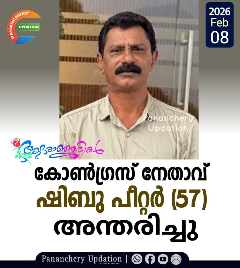 വിലങ്ങന്നൂരിലെ കോൺഗ്രസ് നേതാവും കോൺഗ്രസ്സിൻ്റെ പാണഞ്ചേരി ബ്ലോക്ക് സെക്രട്ടറിയുമായ ഷിബു പീറ്റർ (57) അന്തരിച്ചു. പരേതരായ പീറ്ററിൻ്റേയും സാറാമ്മയുടേയും മകനാണ്. നാളെ (09.02.2026- തിങ്കളാഴ്ച്ച) രാവിലെ ഭൗതിക ശരീരം വീട്ടിലെത്തിക്കും. സംസ്കാരം വൈകിട്ട് 3 മണിക്ക് വസതിയിൽ ശുശ്രൂഷകൾ ആരംഭിച്ച് വിലങ്ങന്നൂർ സെൻ്റ് ജോർജജ് മലങ്കര കത്തോലിക്ക പള്ളിയിൽ. ഭാര്യ: അനു. മക്കൾ: ഷോൺ, ഷാരോൺ.