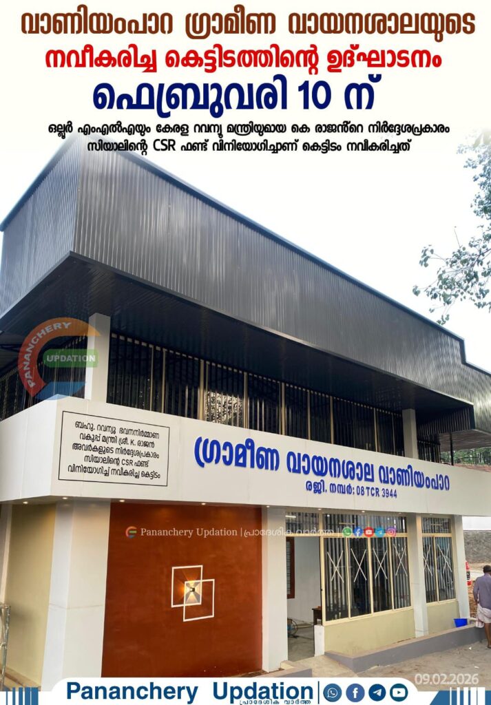 വാണിയംപാറ ഗ്രാമീണ വായനശാലയുടെ നവീകരിച്ച കെട്ടിടത്തിന്റെ ഉദ്ഘാടനം ഫെബ്രുവരി 10 ന്