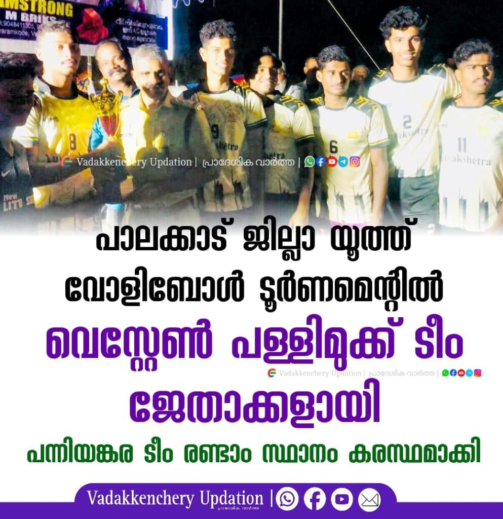 പാലക്കാട് ജില്ലാ വോളിബോൾ ടെക്നിക്കൽ സ്പോർട്സ് കൗൺസിലും വടക്കഞ്ചേരി വെസ്റ്റേൺ ആർട്സ് & സ്പോർട്സ് ക്ലബിന്റെ നേതൃത്വത്തിൽ ജില്ലാ യൂത്ത് വോളിബോൾ ചാമ്പ്യാൻഷിപ് 2026 കാളാംകുളം പള്ളിമുക്കിലെ പ്രത്യേകം സജ്ജീകരിച്ച സ്റ്റേഡിയത്തിൽ നടത്തി .ഉദ്ഘാടനം സിനിമ താരം ജയ്സ് ജോസ് നിർവ്വഹിച്ചു .5 ടീമുകൾ മാറ്റുരച്ച ടൂർണമെന്റിൽ വെസ്റ്റേൺ പള്ളിമുക്ക് ടീം ജേതാക്കളായി പന്നിയങ്കര ടീം രണ്ടാം സ്ഥാനം കരസ്ഥമാക്കി .സമാപന സമ്മേളനം വടക്കഞ്ചേരി സർക്കിൾ ഇൻസ്പെക്ടർ കെ പി ബെന്നി വിജയികൾക്ക് ട്രോഫി നൽകി ആദരിച്ചു .വിവിധ മേഖലകളിൽ വിജയം വരിച്ച പ്രതിഭകളെ ക്ലബ്ബിന്റെ നേത്രത്വത്തിൽ ആദരിച്ചു .