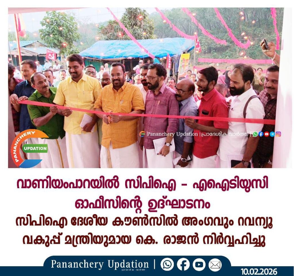വാണിയംപാറയിൽ സിപിഐ – എഐടിയുസി ഓഫീസ് ഉദ്ഘാടനം സിപിഐ ദേശീയ കൗൺസിൽ അംഗവും റവന്യൂ വകുപ്പ് മന്ത്രിയുമായ കെ. രാജൻ നിർവ്വഹിച്ചു.
