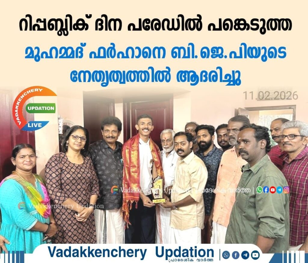 ഡൽഹിയിൽ നടന്ന റിപ്പബ്ലിക് ദിന പരേഡിൽ പങ്കെടുത്ത വടക്കഞ്ചേരിയുടെ അഭിമാനം ഉയർത്തിയ മുഹമ്മദ് ഫർഹാനെ ബി.ജെ.പി നേതൃത്വത്തിൽ ആദരിച്ചു. പാലക്കാട് ജില്ലാ വൈസ് പ്രസിഡൻ്റ് സി.എസ്.ദാസ് പൊന്നാട അണിയിച്ച് ഫർഹാനെ അനുമോദിച്ചു. മണ്ഡലം പ്രസിഡൻ്റ് അഡ്വ.ശ്രീരാജ് വള്ളിയോട് ഉപഹാരം നൽകി.