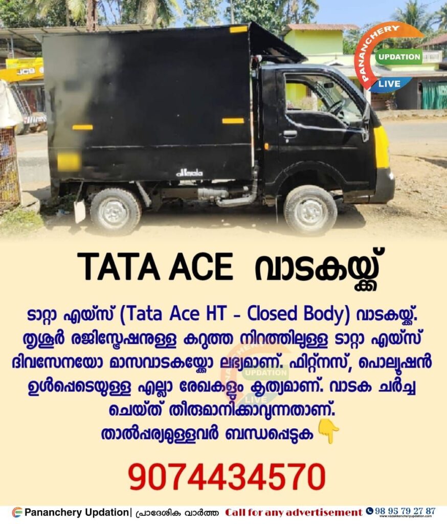 തൃശൂർ രജിസ്ട്രേഷനുള്ള കറുത്ത നിറത്തിലുള്ള ടാറ്റാ എയ്സ് ദിവസേനയോ മാസവാടകയ്ക്കോ ലഭ്യമാണ്. ഫിറ്റ്നസ്, പൊല്യൂഷൻ ഉൾപ്പെടെയുള്ള എല്ലാ രേഖകളും കൃത്യമാണ്. വാടക ചർച്ച ചെയ്ത് തീരുമാനിക്കാവുന്നതാണ്.