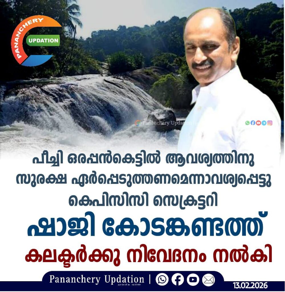 പീച്ചി ഒരപ്പൻകെട്ടിൽ ആവശ്യത്തിനു സുരക്ഷ ഏർപ്പെടുത്തണമെന്നാവശ്യപ്പെട്ടു കെപിസിസി സെക്രട്ടറി ഷാജി കോടങ്കണ്ടത്ത് കലക്ടർക്കു നിവേദനം നൽകി.ഇവിടെ സുരക്ഷയില്ലാത്ത ഭാഗത്ത് സഞ്ചാരികൾ വെള്ളത്തിലിറങ്ങി പലതവണ അപകടങ്ങളുണ്ടായിട്ടുണ്ട്. ആംബുലൻസും അഗ്നിരക്ഷാ സേനയുടെ വാഹനങ്ങളും ഒരപ്പൻകെട്ടിന്റെ തൊട്ടടുത്ത് എത്തിക്കുന്നതിനാവശ്യമായ സൗകര്യം ഏർപ്പെടുത്തണം. കൂടുതൽ മുന്നറിയിപ്പ് ബോർഡുകൾ സ്ഥാപിക്കുന്നതിനും സുരക്ഷയ്ക്കായി വാച്ചർമാരെ നിയമിക്കുന്നതിനും നടപടിയെടുക്കണമെന്നു നിവേദനത്തിൽ ആവശ്യപ്പെട്ടു.