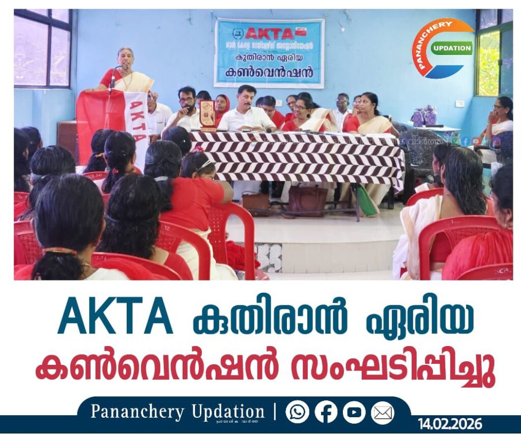 AKTA കുതിരാൻ ഏരിയ കൺവെൻഷൻ പട്ടിക്കാട് പാണഞ്ചേരി സർവീസ് സഹകരണ സംഘം ഹാളിൽ വെച്ച് വൈസ് പ്രസിഡന്റ് എബിൻ ഗോപുരത്തിന്റെ അധ്യക്ഷതയിൽ തൃശ്ശൂർ ജില്ല ട്രഷറർ PM പുഷ്പകുമാരി ഉദ്ഘാടനം ചെയ്തു. പാണഞ്ചേരി ഗ്രാമപഞ്ചായത്തിലേക്ക് ജനപ്രതിനിധിയായി തിരഞ്ഞെടുക്കപ്പെട്ട AKTA മെമ്പർമാരായ സീന വർഗീസിനെയും സന്ധ്യ ഷാജിയേയും സോഫി ജിജിയേയും പൊന്നാട നൽകി ആദരിച്ചു. മെഡിക്കൽ മൈക്രോബയോളജിയിൽ ഫസ്റ്റ് റാങ്ക് നേടിയ കണ്ണാറ യൂണിറ്റ് അംഗം കുമാരി അരുന്ധതി സതീഷിനെ അനുമോദിച്ചു. സെക്രട്ടറി T A ജയ റിപ്പോർട്ടും, ട്രഷറർ K K ശ്രീനിവാസൻ വരവ് ചിലവ് കണക്കുകളും അവതരിപ്പിച്ചു. തൊഴിലാളികളുടെ കുടിശ്ശികയായി കിടക്കുന്ന വർധിപ്പിച്ച റിട്ടയർമെന്റ് ആനുകൂല്യം വിതരണം ചെയ്യുക പ്രസവാനുകൂല്യം 15,000 രൂപ ഒറ്റത്തവണയായി കുടിശ്ശികയടക്കം കാലതാമസം ഇല്ലാതെ വിതരണം ചെയ്യുക തൊഴിലാളികൾക്ക് അർഹതപ്പെട്ട ESI ആനുകൂല്യം നടപ്പിലാക്കുക എന്നീ ആവശ്യങ്ങൾ ഉന്നയിച്ച് കൺവെൻഷനിൽ പ്രമേയം അവതരിപ്പിച്ചു. മെമ്പർഷിപ്പ് വർക്കിൽ മികവ് പുലർത്തിയ യൂണിറ്റ് സെക്രട്ടറിമാരെ ചടങ്ങിൽ അനുമോദിച്ചു. ജസീന്ത പോളി സ്വാഗതം പറഞ്ഞ ചടങ്ങിൽ ബിൻസി ബേബി നന്ദി പറഞ്ഞു. കൺവെൻഷൻ ഒരു മണിക്ക് അവസാനിച്ചു
