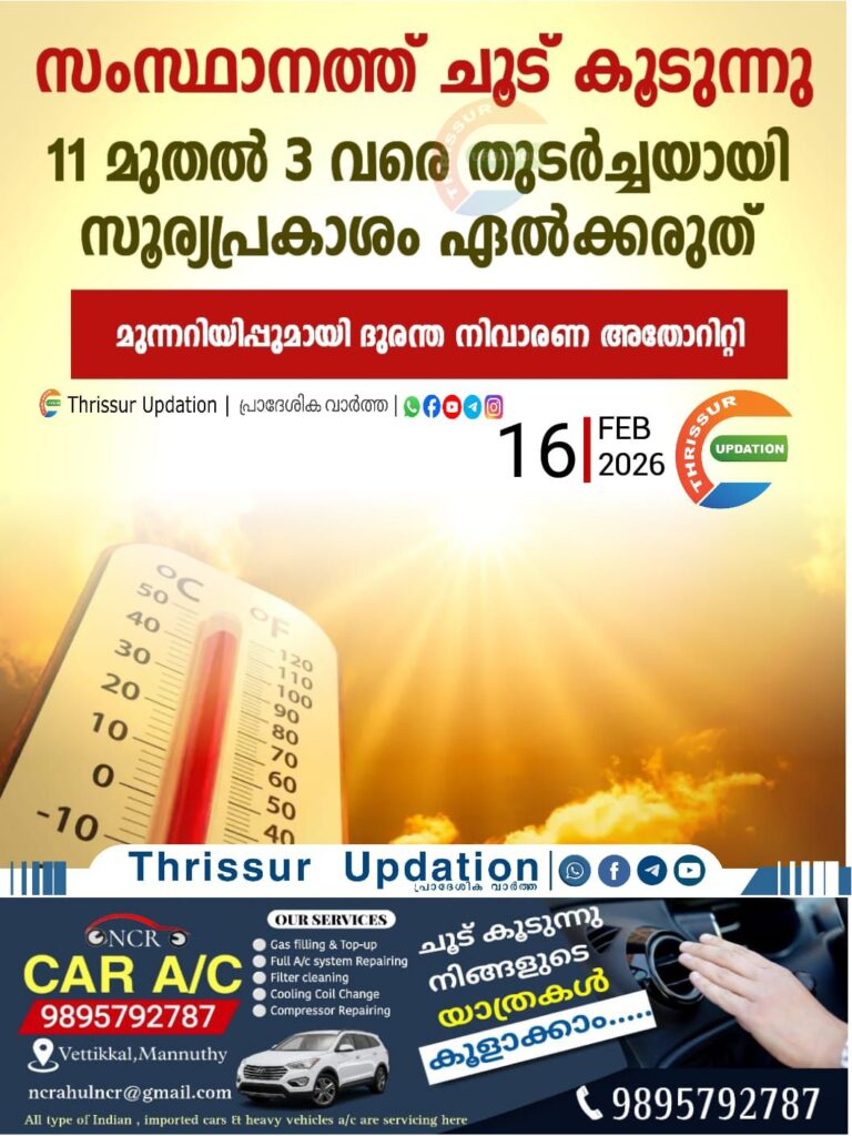 സംസ്ഥാനത്ത് ചൂട് കൂടുന്നു; 11 മുതൽ 3 വരെ തുടർച്ചയായി സൂര്യപ്രകാശം ഏൽക്കരുത്; മുന്നറിയിപ്പുമായി ദുരന്ത നിവാരണ അതോറിറ്റി