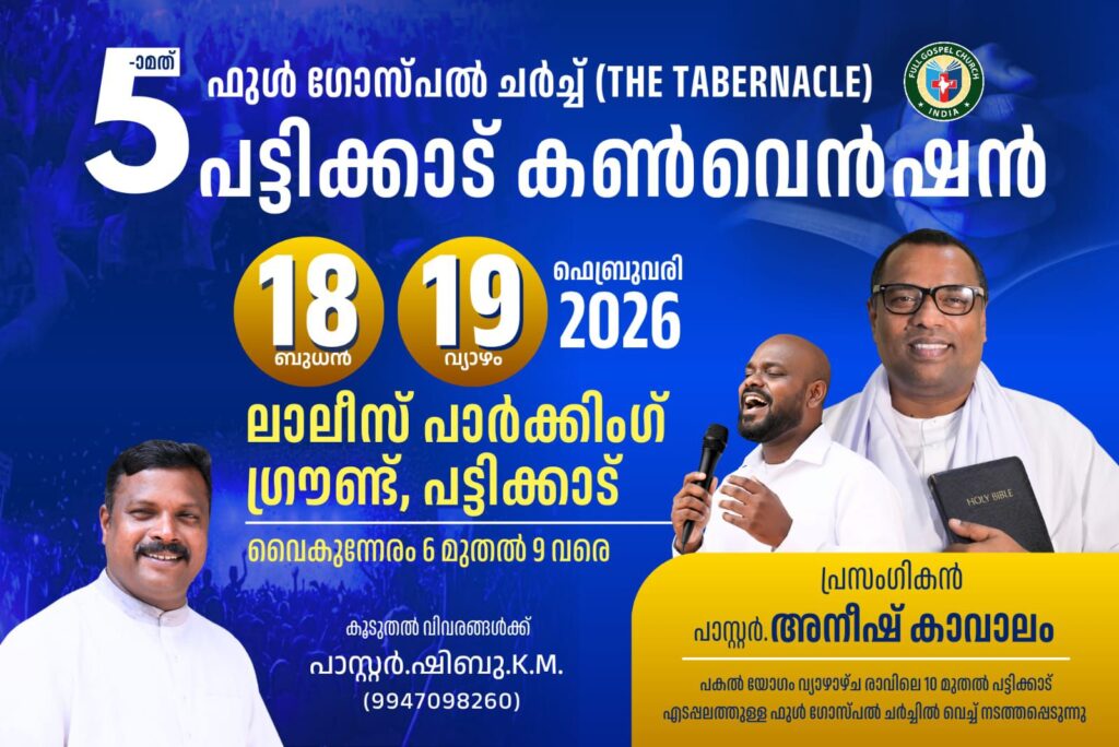 അഞ്ചാമത് ഫുൾ ഗോസ്പൽ ചർച്ച് ( THE TABERNACLE) പട്ടിക്കാട് കൺവെൻഷൻ *ഫെബ്രുവരി -18,19 തിയ്യതികളിലായി ലാലീസ് പാർക്കിംഗ് ഗ്രൗണ്ടിൽ നടക്കും.*