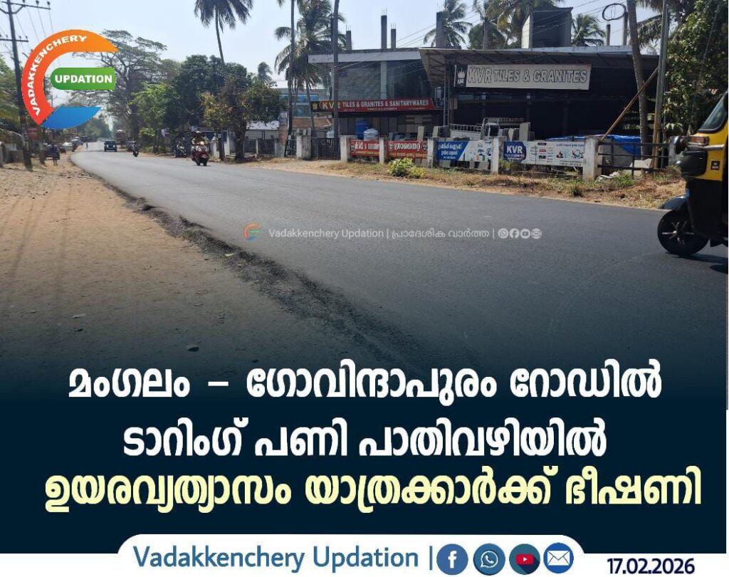 മംഗലം–ഗോവിന്ദാപുരം റോഡ് സംസ്ഥാനപാതയിൽ ടാറിംഗ് പൂർത്തിയായതിന് പിന്നാലെ വശങ്ങളിലെ ഉയരവ്യത്യാസം പുതിയ അപകടസാധ്യതയായി മാറി. ടാറിംഗ് നടത്തിയ ഭാഗങ്ങളിൽ റോഡിന്റെ മദ്ധ്യഭാഗം ഉയർന്നതും വശങ്ങൾ താഴ്ന്നതുമായ അവസ്ഥയാണുള്ളത്.