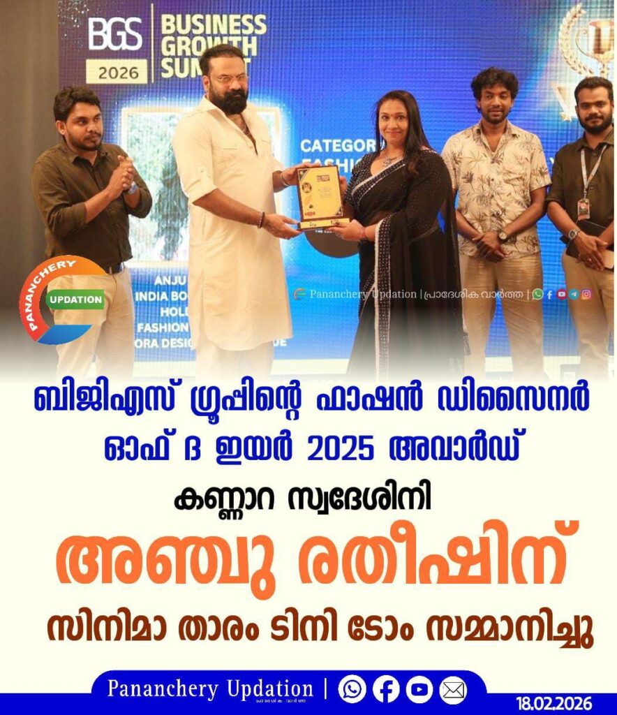 ബിജിഎസ് ഗ്രൂപ്പിന്റെ ഫാഷൻ ഡിസൈനർ ഓഫ് ദ ഇയർ 2025 അവാർഡ് അഞ്ചു രതീഷിന് സിനിമാ താരം ടിനി ടോം സമ്മാനിച്ചു. ജാങ്കോ സ്പേസ് അവതാരകൻ ശ്രീനാഥ് കെ ജനാർദ്ദനൻ, BGS ഗ്രൂപ്പിന്റെ ഡയറക്ടർ ആസിഫ്, ബിജിൽ ബിനീഷ് (mr. India 2025) തുടങ്ങിയവർ ചടങ്ങിൽ സംബന്ധിച്ചു. India book of records holder ആണ് അഞ്ചു. Miniature dress design ചെയ്താണ് അഞ്ചു റെക്കോർഡ് നേടിയത്. ഭർത്താവ് രതീഷ് കാടായത്ത്. മക്കൾ. അതുൽ, റിഷോൺ, ധ്യാൻ സൂര്യ. കണ്ണാറ സ്വദേശിനി ആണ് അഞ്ചു രതീഷ്