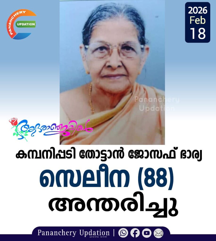 കമ്പനിപ്പടി തോട്ടാൻ ജോസഫ് ഭാര്യ സെലീന (88) അന്തരിച്ചു. സംസ്കാരം ഇന്ന് (18.02.2026- ബുധനാഴ്ച്ച) വൈകീട്ട് 4.30ന് തോട്ടാൻ ജോസഫ് ആന്റോയുടെ വസതിയിൽ നിന്നും ആരംഭിച്ച് കണ്ണാറ സെന്റ് ജോസഫ്സ് പള്ളിയിൽ. മക്കൾ: ആന്റോ, ആനി, പുഷ്പം, മരിയ, ഫാ. ജോർജ് തോട്ടാൻ സിഎംഐ, ജോഷി. മരുമക്കൾ: ലീന, സേവ്യർ, ഡേവിസ്, ജോൺ, സിനു.