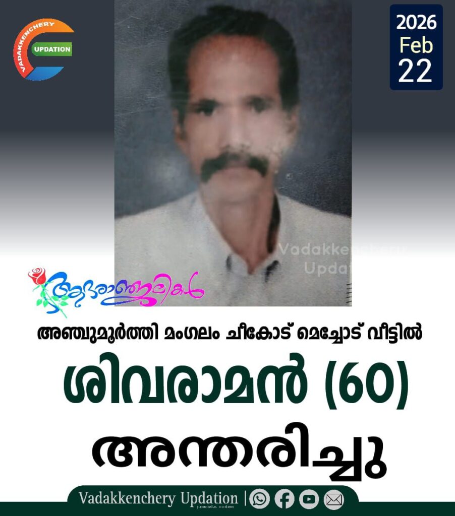 അഞ്ചുമൂർത്തി മംഗലം ചീകോട് മെച്ചോട് വീട്ടിൽ പരേതനായ കണ്ടമുത്തൻ മകൻ ശിവരാമൻ (60) അന്തരിച്ചു.സംസ്ക്കാരം നാളെ (23/2/2026-തിങ്കളാഴ്ച) രാവിലെ 10മണിക്ക് തിരുവില്ലാമല ഐവർ മഠത്തിൽ. സഹോദരങ്ങൾ : പരേതനായ ബാലൻ, പരേതനായ നാരായണൻ, യശോദ, സുമിത്ര.