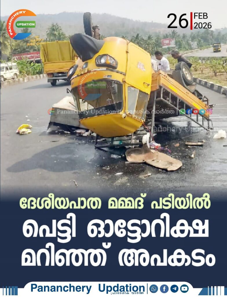 ദേശീയപാത 544 ൽ കുതിരാൻ പാലത്തിനു സമീപം മമ്മദ് പടിയിൽ മീൻ കയറ്റി വന്ന പെട്ടി ഓട്ടോറിക്ഷ ഡിവൈഡറിൽ ഇടിച്ച് അപകടം. തൃശ്ശൂർ ദിശയിൽ നിന്നും വടക്കഞ്ചേരിയിലേക്ക് പോകുന്ന പെട്ടി ഓട്ടോറിക്ഷയാണ് അപകടത്തിൽപ്പെട്ടത്. അപകടത്തെ തുടർന്ന് വാഹനം മറിഞ്ഞു. രാവിലെ 10. 45 ഓടുകൂടിയാണ് അപകടം നടന്നത്. അപകടത്തിൽ ഡ്രൈവർക്ക് ചെറിയ പരിക്കേറ്റു