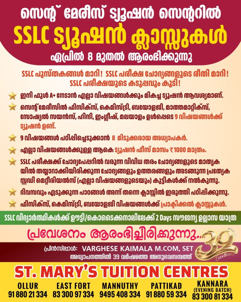 🌟സെന്റ് മേരീസിൽ ഫിസിക്സ്, കെമിസ്ട്രി, ബയോളജി, മാത്തമാറ്റിക്സ്, സോഷ്യൽ സയൻസ്, ഹിന്ദി, ഇംഗ്ലീഷ്, മലയാളം ഉൾപ്പെടെ 9 വിഷയങ്ങൾക്ക് ട്യൂഷൻ ഉണ്ട്.