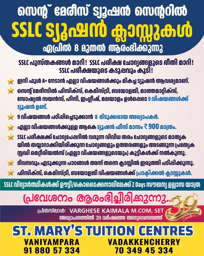 🌟സെന്റ് മേരീസിൽ ഫിസിക്സ്, കെമിസ്ട്രി, ബയോളജി, മാത്തമാറ്റിക്സ്, സോഷ്യൽ സയൻസ്, ഹിന്ദി, ഇംഗ്ലീഷ്, മലയാളം ഉൾപ്പെടെ 9 വിഷയങ്ങൾക്ക് ട്യൂഷൻ ഉണ്ട്.