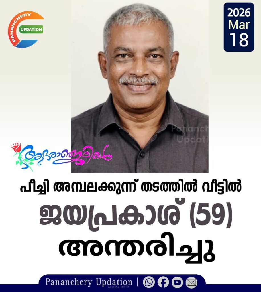 പീച്ചി അമ്പലക്കുന്ന് തടത്തിൽ വീട്ടിൽ പരേതനായ ശേഖരൻ മകൻ ജയപ്രകാശ് (59) അന്തരിച്ചു. വിലങ്ങന്നൂരിൽ ഹോട്ടൽ വ്യാപാരി ആയിരുന്നു. സംസ്കാരം നാളെ (19.03.2026- വ്യാഴാഴ്ച) രാവിലെ 10ന് വടൂക്കര ശ്മശാനത്തിൽ. ഭാര്യ: സ്മിത. മക്കൾ: സ്മിജ, ജഗൻ. മരുമകൻ: മജീഷ്.