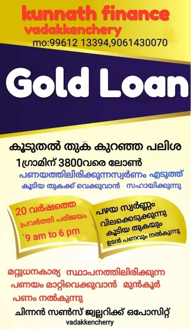 മറ്റു ബാങ്കുകളിൽ ഇരിക്കുന്ന സ്വർ ണ്ണം എടുത്ത് വിൽക്കുവാൻ മുൻകൂ ർ പണം നൽകുന്നു. ചിന്നൻ സൺസ് ജ്വല്ലറിക്ക് ഒപോസിറ്റ് വടക്കഞ്ചേരി